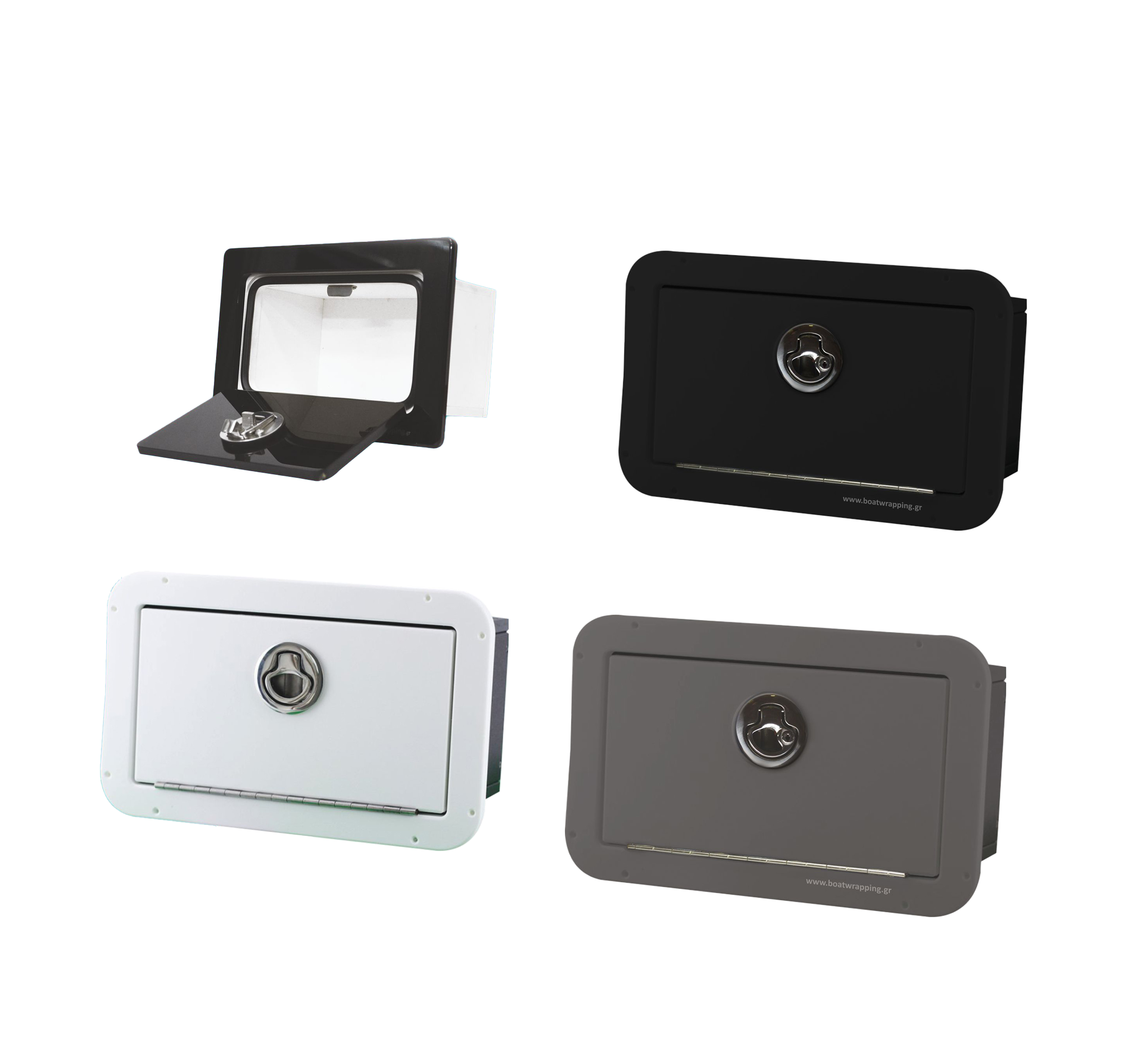 Their construction materials are plexi glass 10mm or KingStarBoard in black, white and grey and their metal parts (lock, hinges, screws) are exclusively made of stainless steel. They can be installed very easily using either screws or glue, following the template enclosed in the package. It is possible to engrave a logo or design using a laser machine.